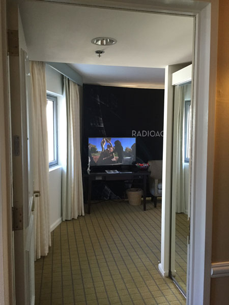 Tom Hartmann on the screen as "Searching for Eddie Running Wolf 2015" plays in the Radioactive Giant lounge