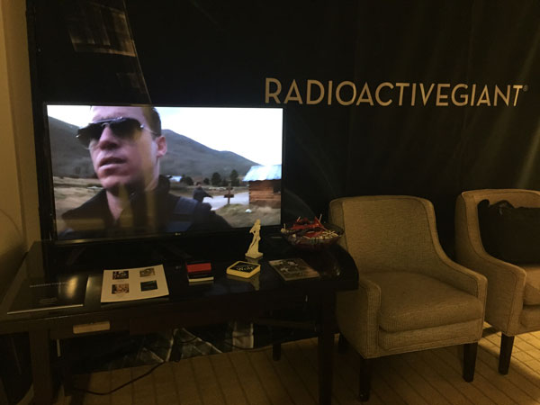 Tom Hartmann and Juan Montelongo visit the Radioactive Giant booth at American Film Market 2015