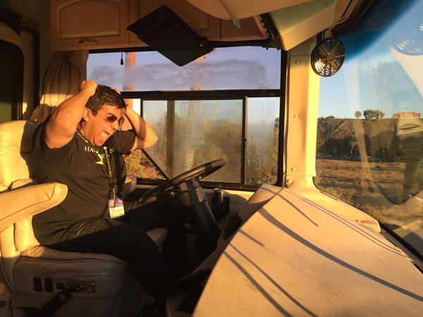 Juan Monetlongo pilots Big Bertha, the official "Searching for Eddie Running Wolf 2015" tour bus