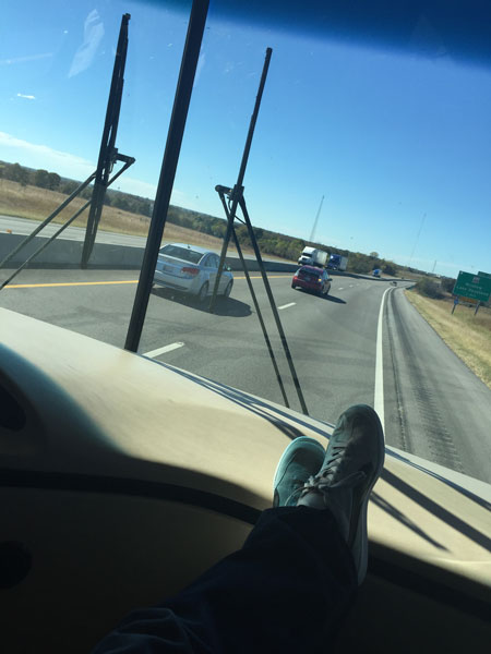 Great view of the road ahead from the co-pilot seat of the promotional tour bus