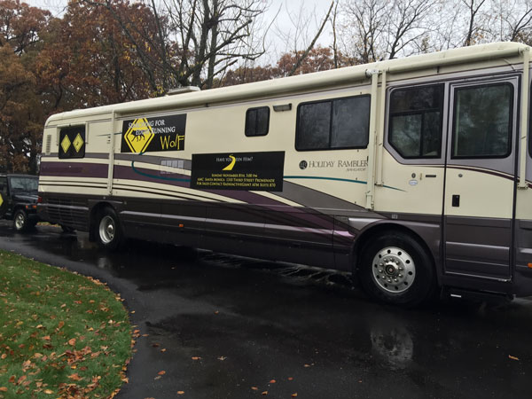 "Searching for Eddie Running Wolf " tour bus parked