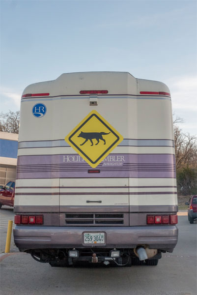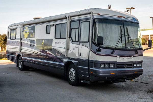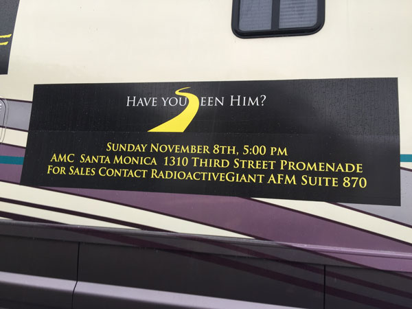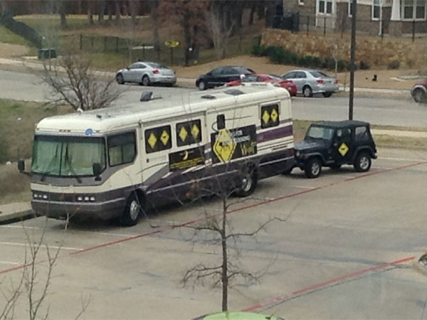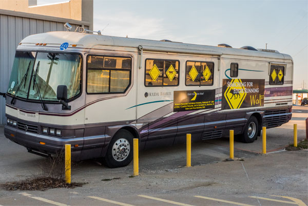 "Searching for Eddie Running Wolf " tour bus parked